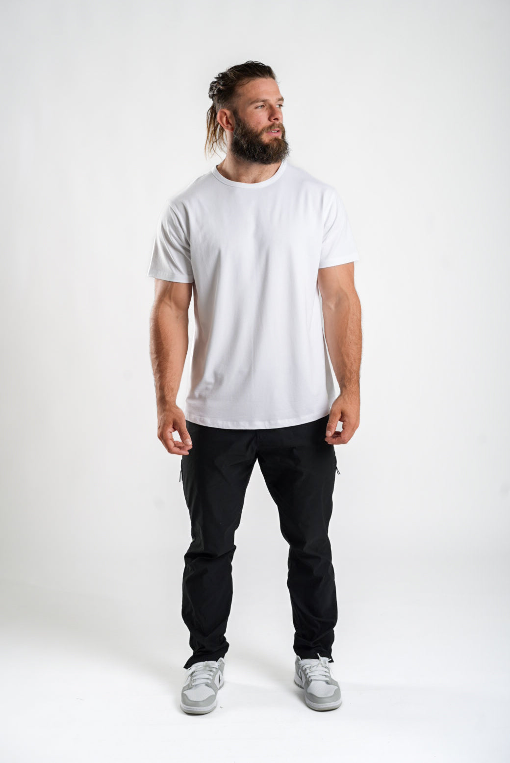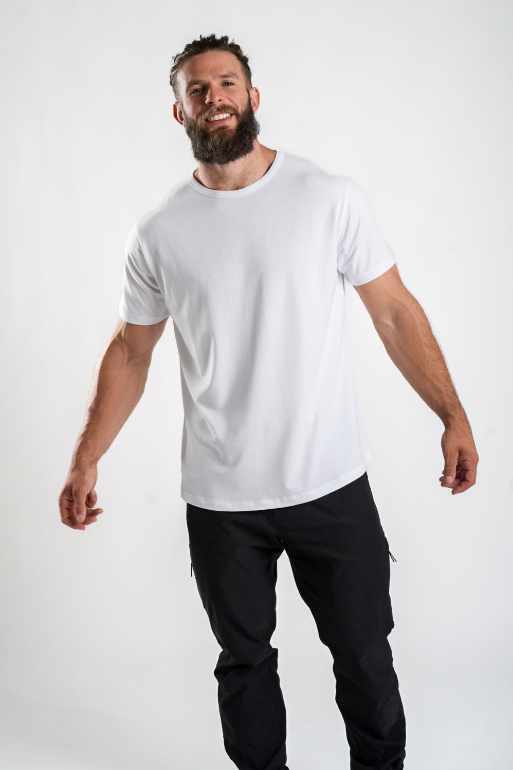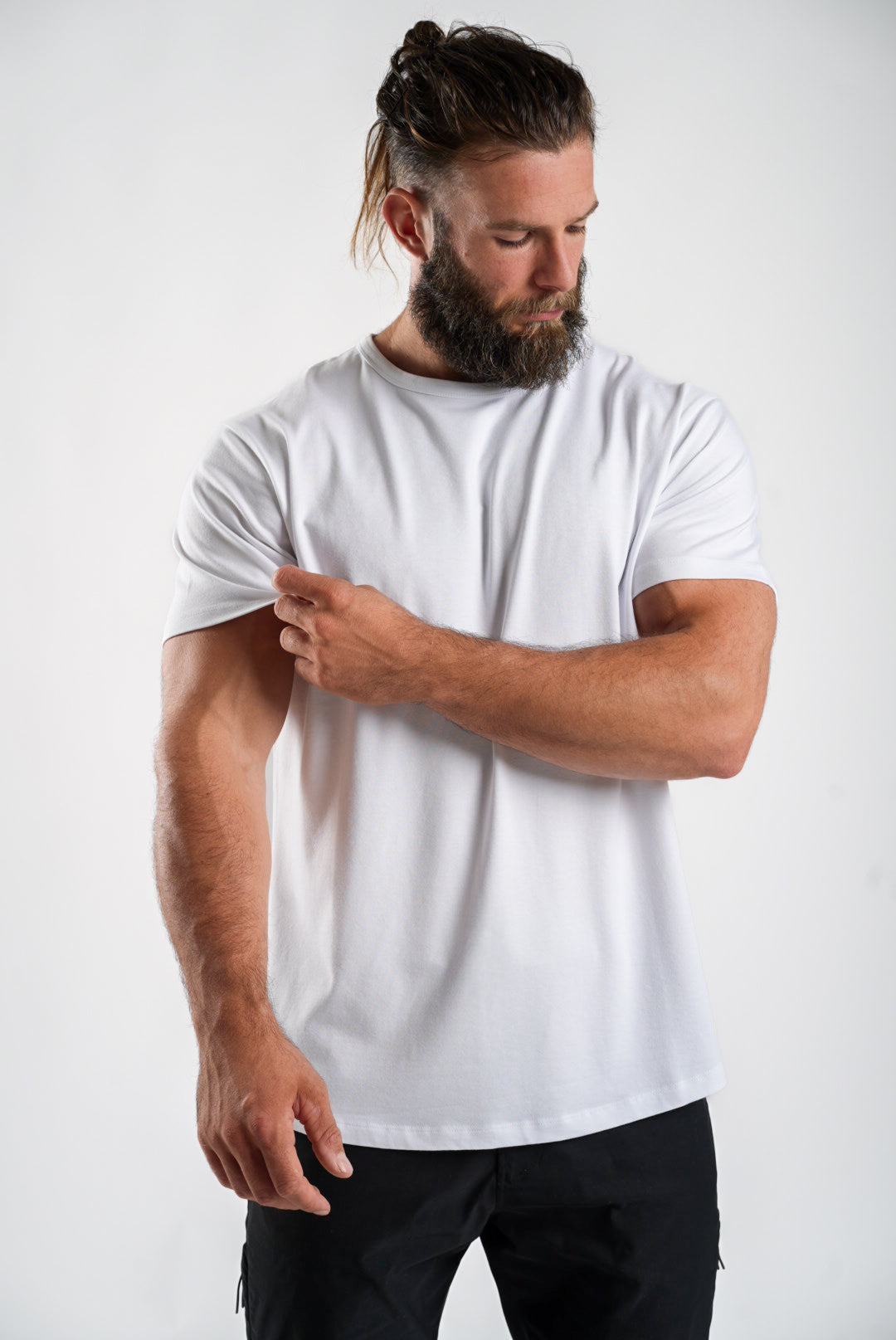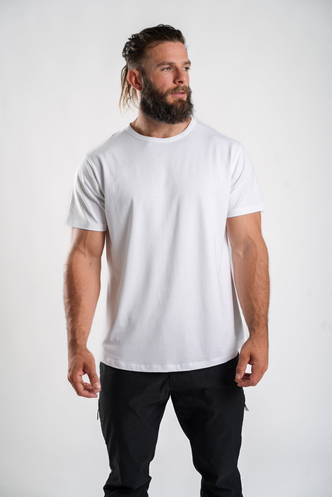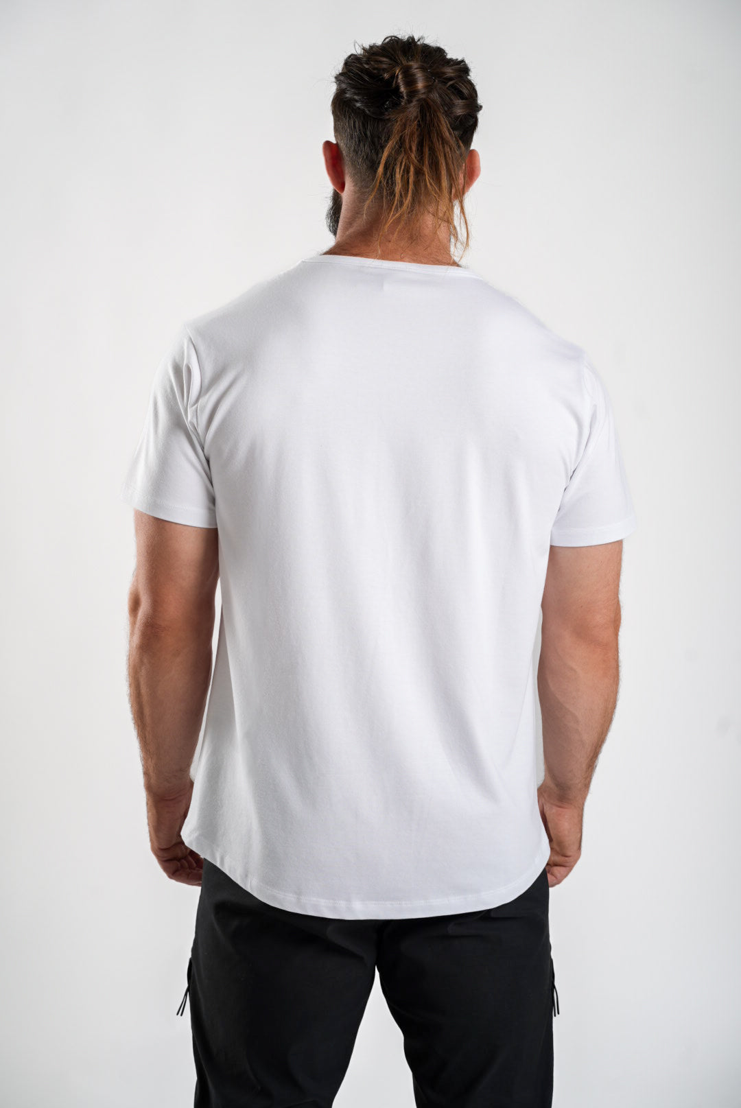 Meet all day, every day style and comfort. Crafted from a premium cotton blend, this tee delivers unmatched softness, lightweight breathability, and natural stretch that moves with you. The dropped hem in the front and back adds a modern edge to a classic silhouette, while the tonal textured logo at the hem keeps the look clean and versatile. From morning grind to evening downtime, this is the essential your wardrobe’s been missing.
