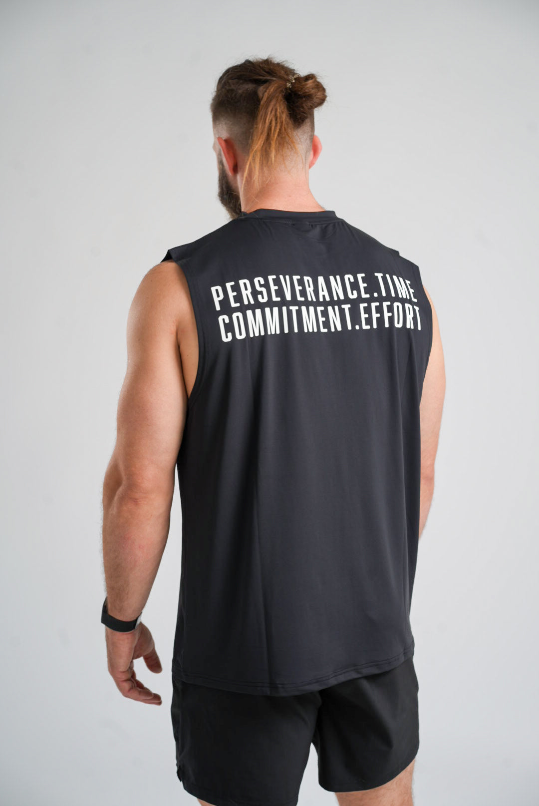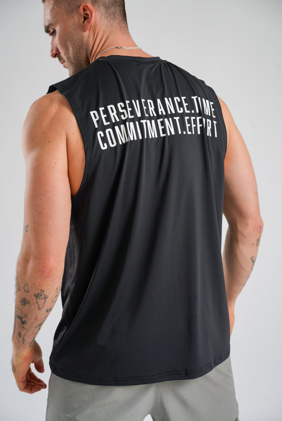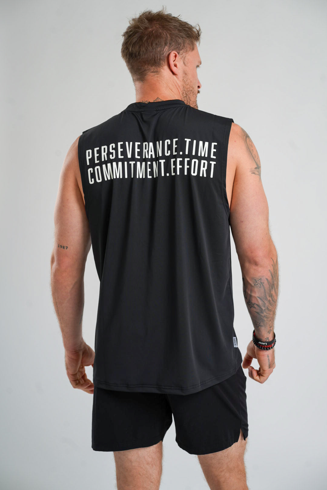 Perseverance takes time. Commitment takes effort. Wear this message proudly with our new tech tank. Crewneck design and regular fit with comfort, stretch, and breathability that will help you push through any workout. This material is a sell-out favorite. Built for comfort, built for performance.