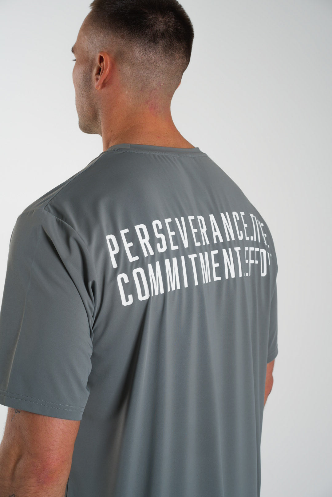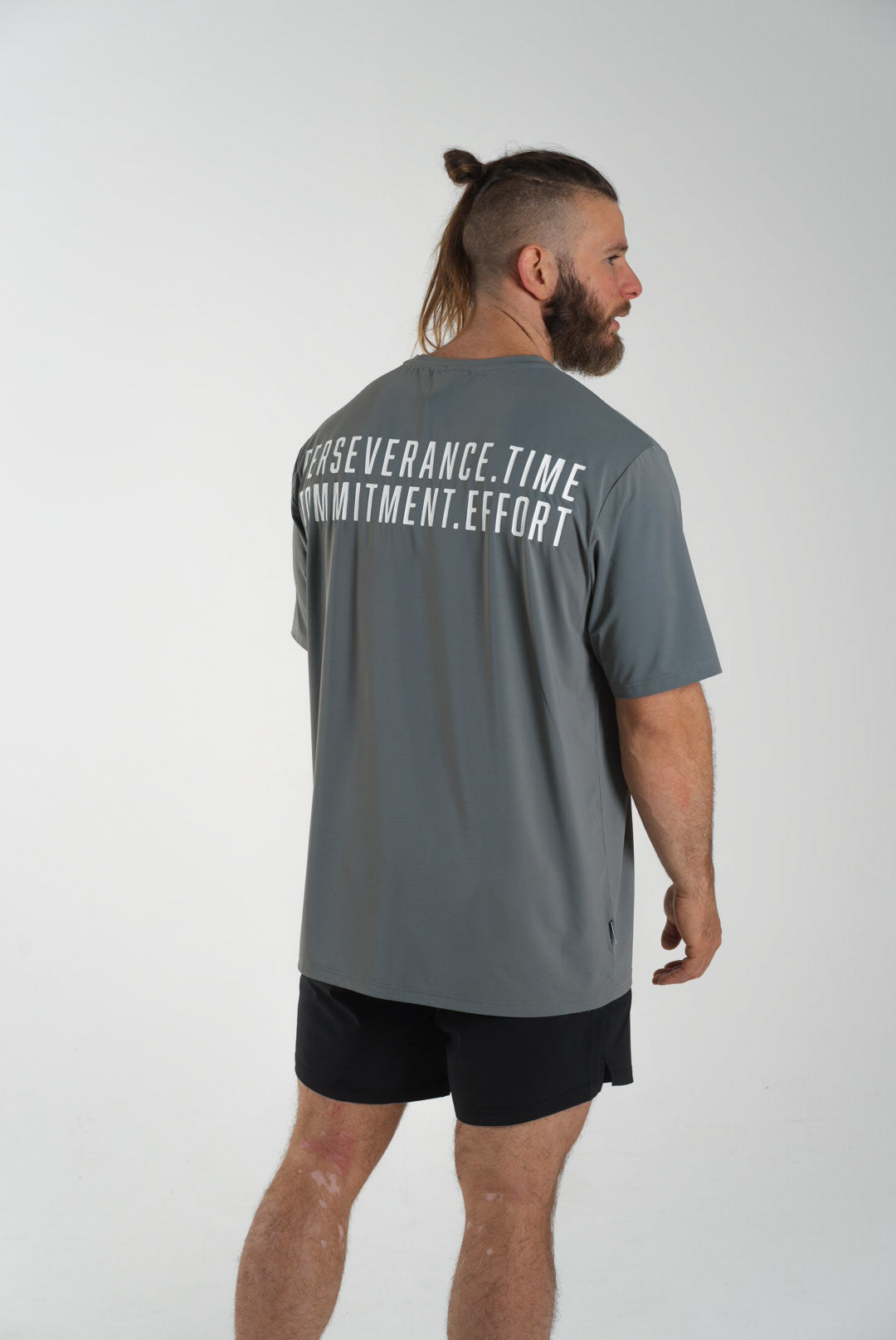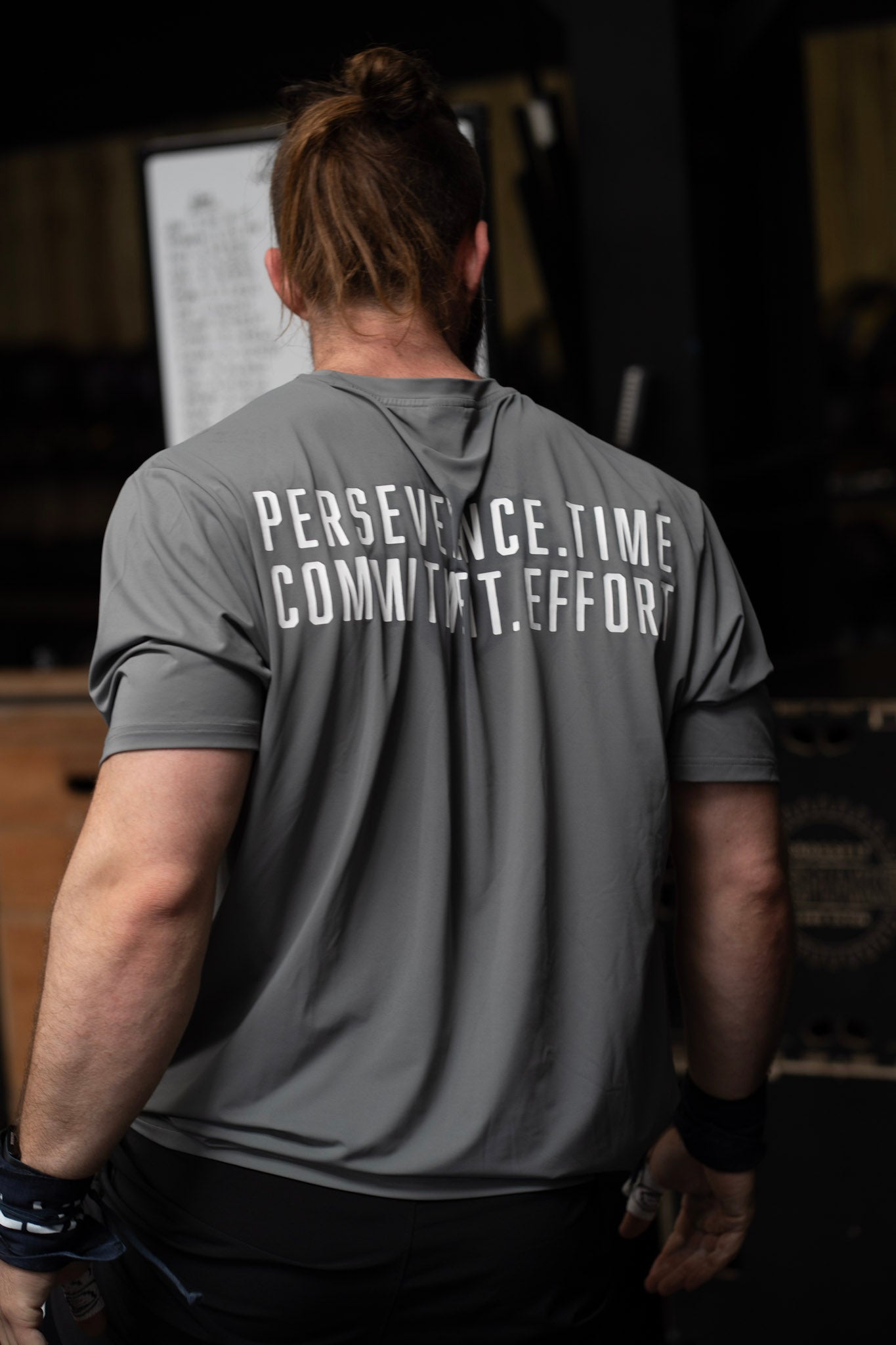 Perseverance takes time. Commitment takes effort. Wear this message proudly with our tech tees. Crewneck design and regular fit with comfort, stretch, and breathability that will help you push through any workout. These are a sell-out favorite. Built for comfort, built for performance.