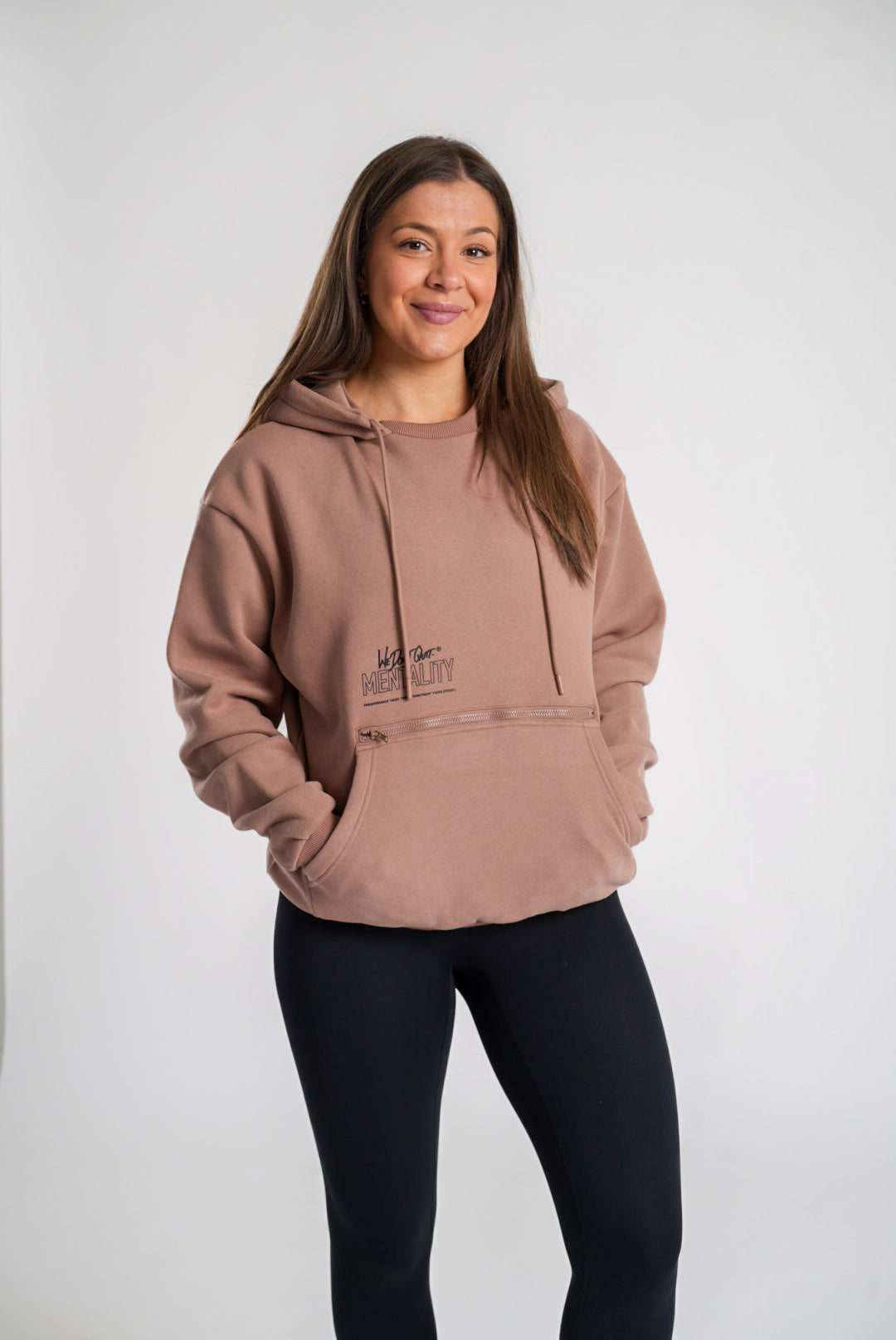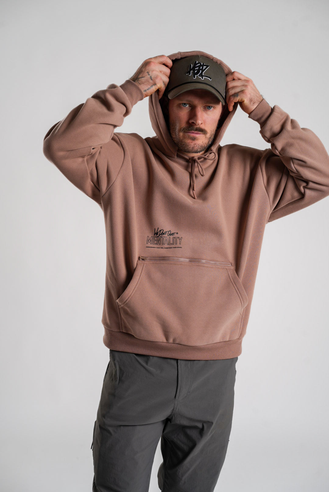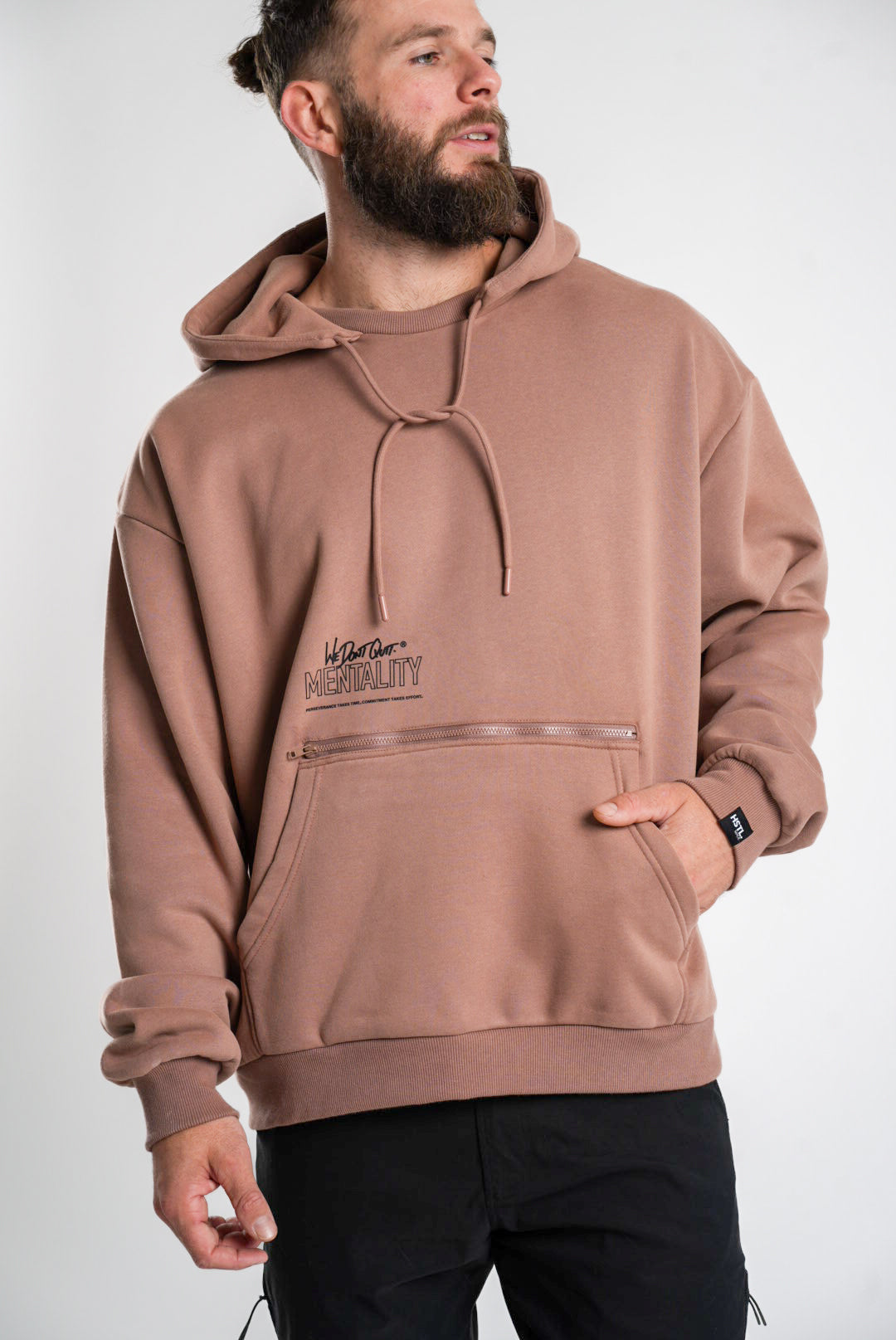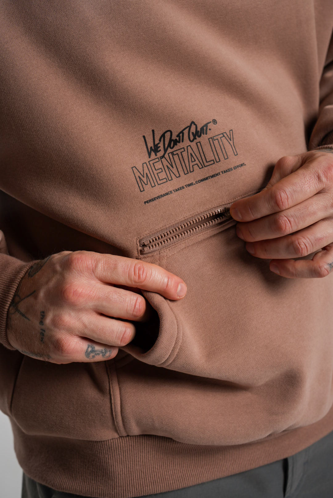 You'll be reaching for the Utility Hoodie every day. Ultimate comfort, style, and functionality collide. Featuring a paneled hood and crewneck insert detail, a zippered pocket behind the kangaroo pouch, and our "We Don't Quit" messaging to get you through the daily hustle.
