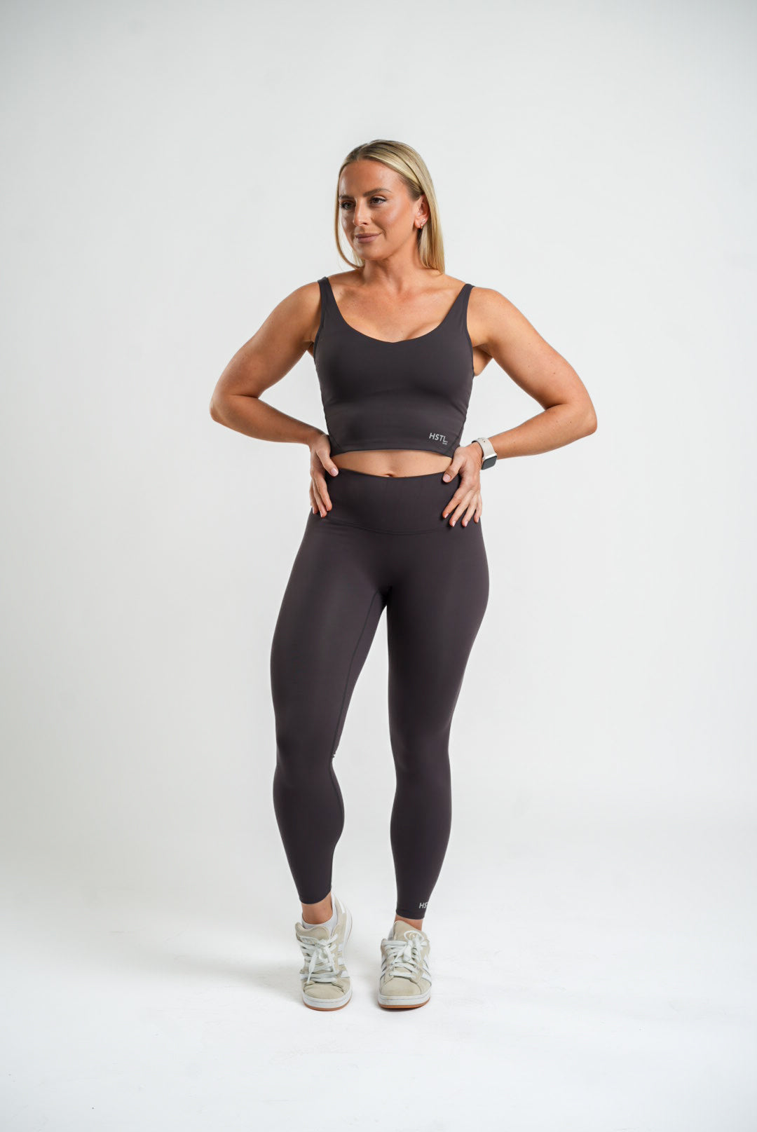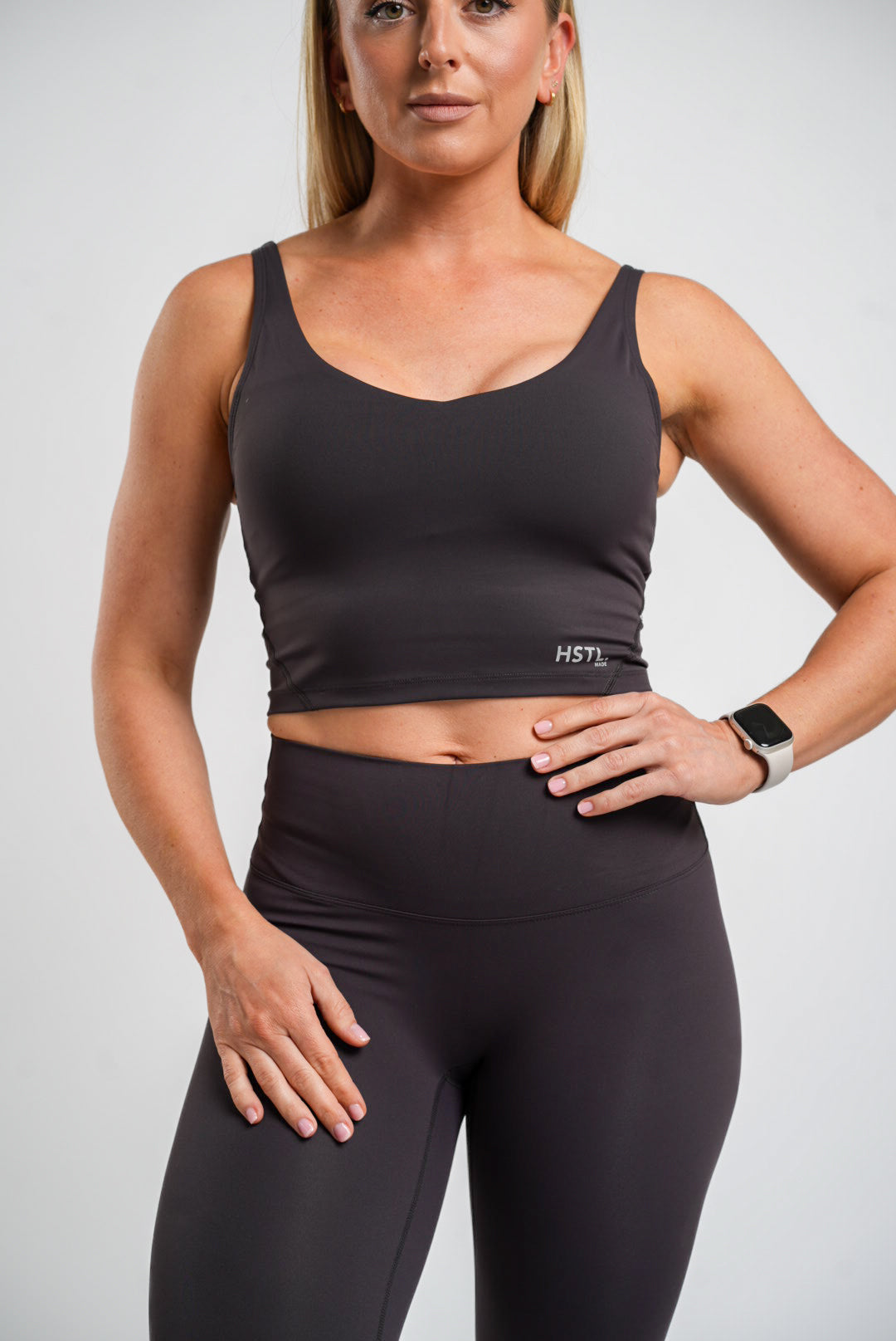 Cropped style bra top with a subtle design on the front. Built for comfort and support.