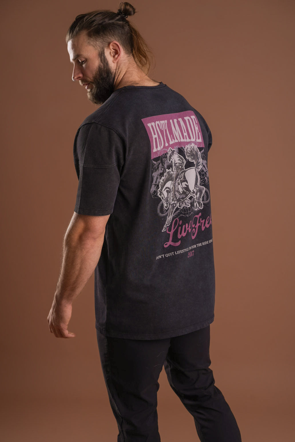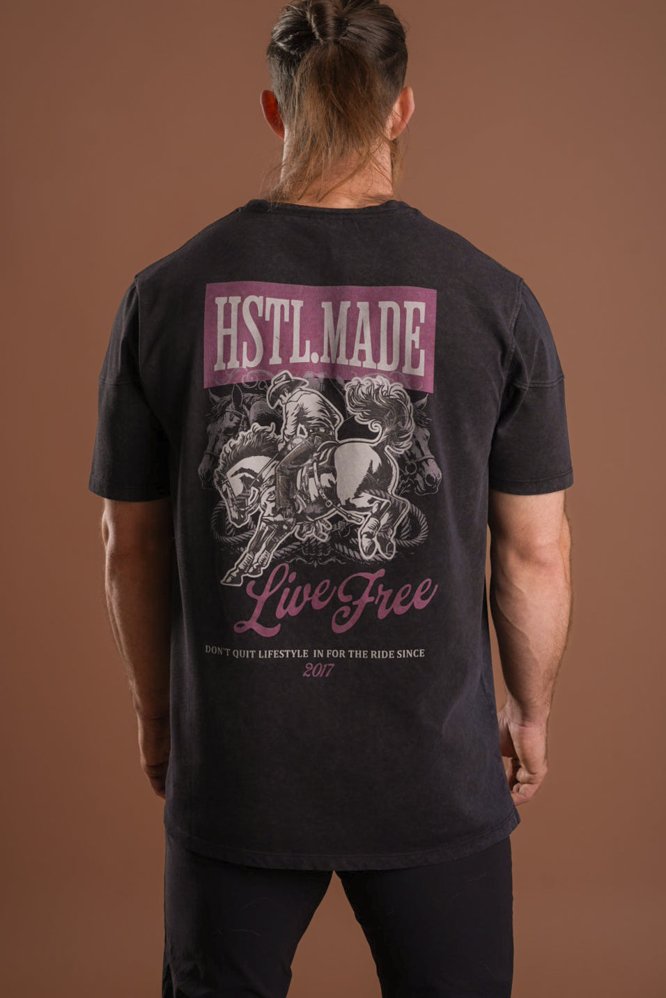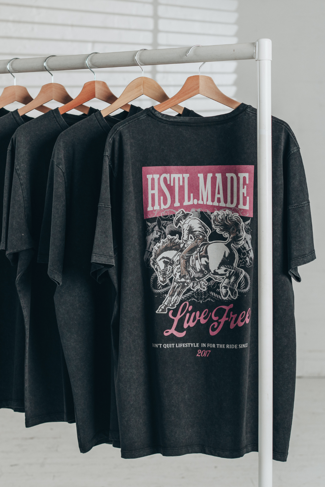 Your new go-to tee for anywhere the day takes you. This statement tee brings that lived-in feel from the first wear, thanks to its vintage wash, distressed details, and relaxed, boxier fit. The front features two subtle hits — our Western logo on the left and “Live Free” on the right — while the back delivers the full impact with a bold “Live Free” graphic that captures the confidence and freedom we aim to carry into every moment.